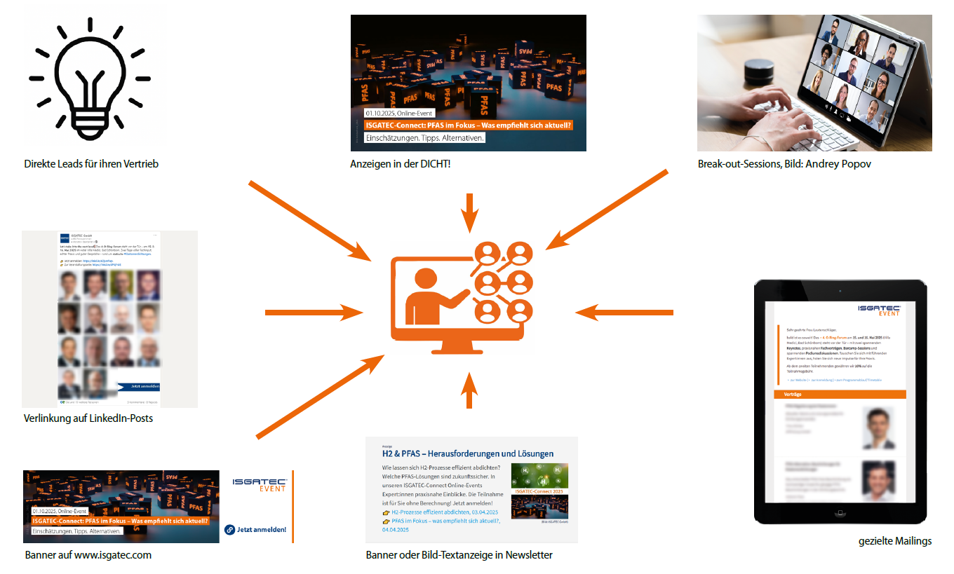 ISGATEC-Connect bietet Ihnen die ideale Bühne, um Ihre fachliche Kompetenz sichtbar zu machen – vor, während und nach unseren digitalen Fach-Events.